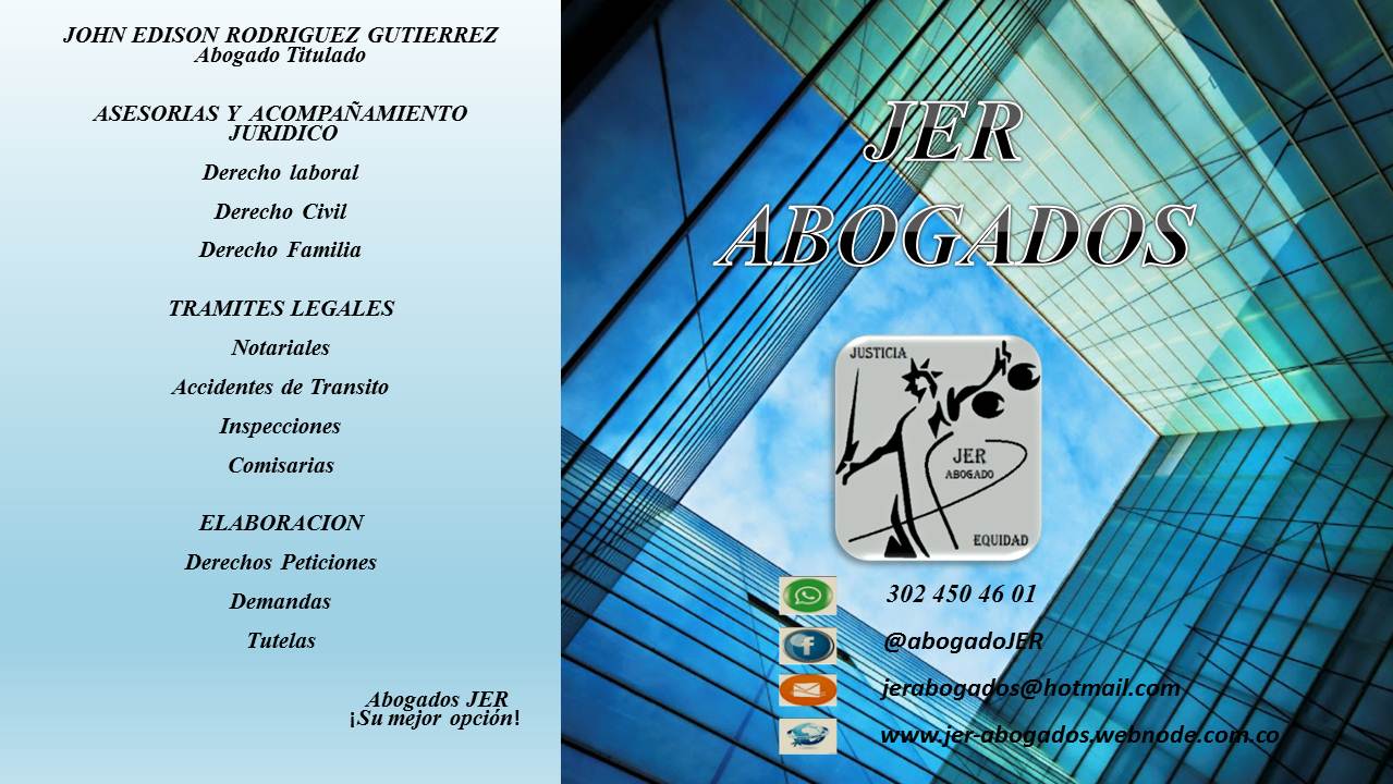 ABOGADOS JER ofrece servicios de asesorías y tramites juridico y/o legales tanto en los estrados judiciales como en la entidades administrativa de nuestro país, brindandole a nuestros clientes un acompañamiento profesional en sus conflictos de intereses ya sea particulares o publicas, reclamando sus derechos que le acontecen como personas.